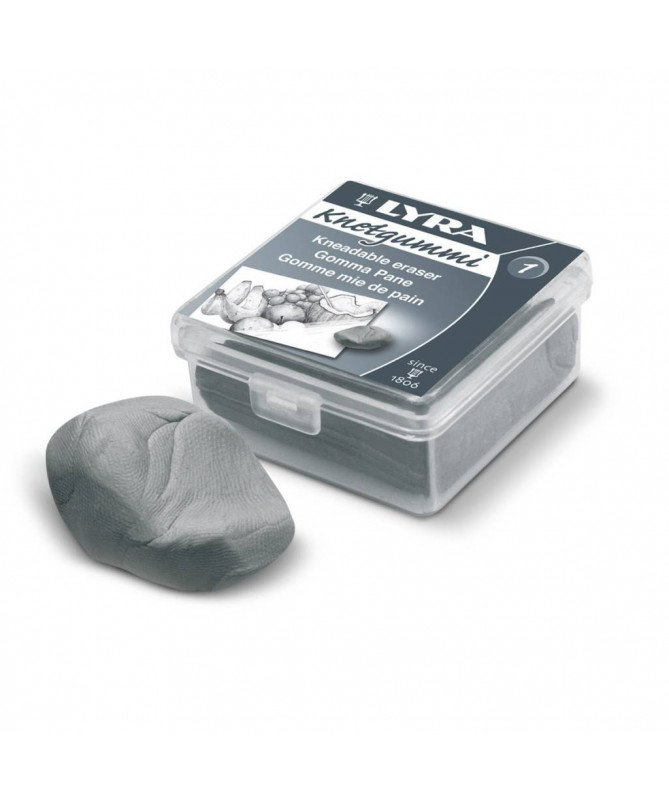 Gomë e butë për thëngjill Lyra Kneadable Eraser, e dizajnuar për korrigjim dhe ndriçim të vizatimeve me thëngjill, shkumës dhe pastel. Materiali elastik mund të formohet sipas nevojës, duke lejuar fshirje shumë të kontrolluar dhe punë precize në detaje.