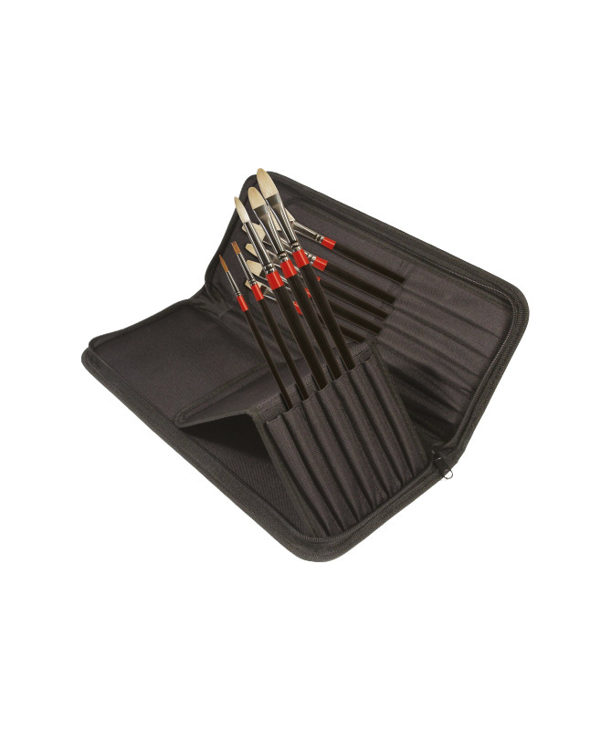 10 furça të përzgjedhura për teknikë vajore, të ruajtura në një zip case të fortë dhe elegant.