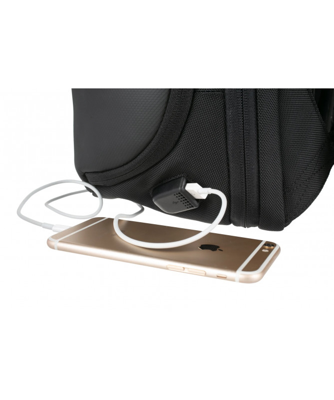 Materiali cilësor është rezistent ndaj ujit dhe papastërtive, ndërsa shpina me ventilim dhe rripat ergonomikë të shpatullave sigurojnë rehati gjatë gjithë ditës. Përfshin edhe portë USB për karikim dhe rrip për valixhe (trolley loop).