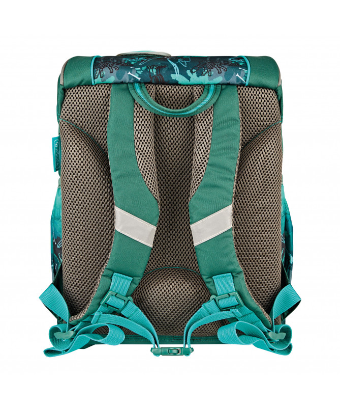 Çanta është e pajisur me mbyllje click-lock me element reflektues, bazë të fortë dhe stabile, si dhe material reflektues Orafol, që rrit dukshmërinë dhe sigurinë e fëmijës në trafik. Hapësira e brendshme është e organizuar me ndarje për libra, xhep frontal dhe dy xhepa anësorë, duke ofruar funksionalitet të plotë shkollor.