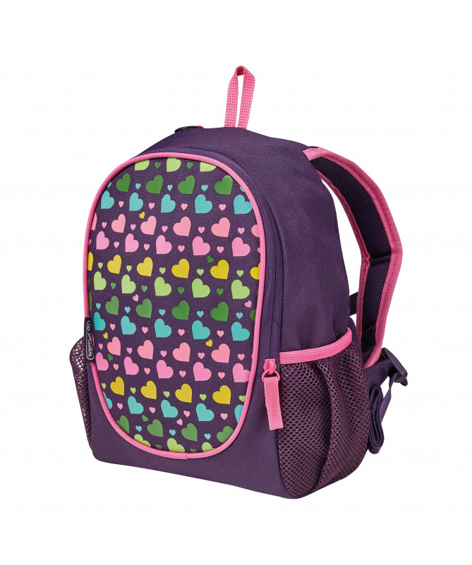 Çantë e vogël për fëmijë nga Herlitz, e përshtatshme për kopsht dhe përdorim të përditshëm. Dizajn i gjallë me motive zemrash shumëngjyrëshe, e lehtë dhe ergonomike për rehati gjatë mbajtjes.