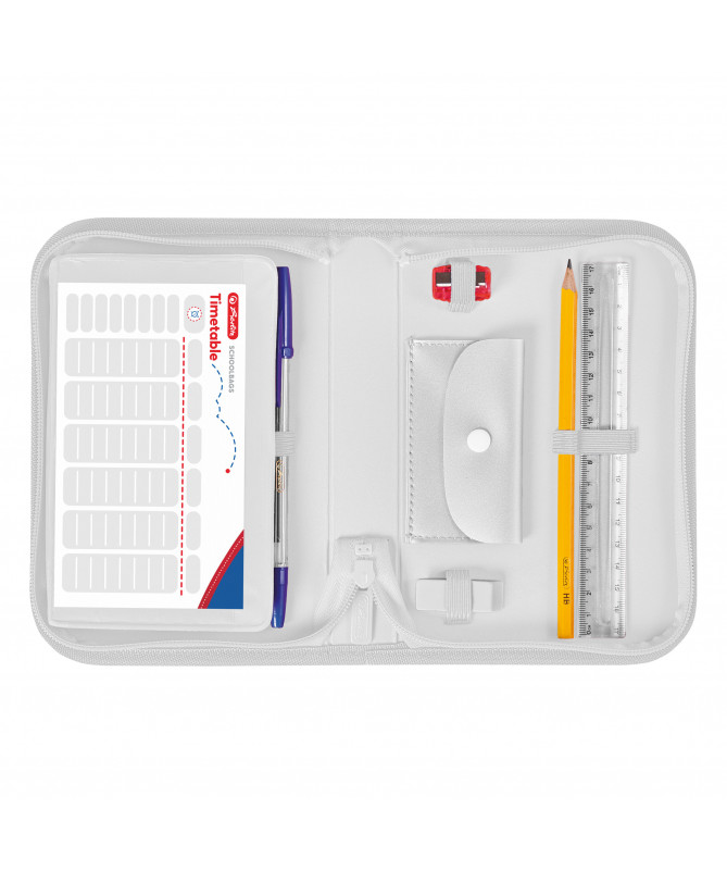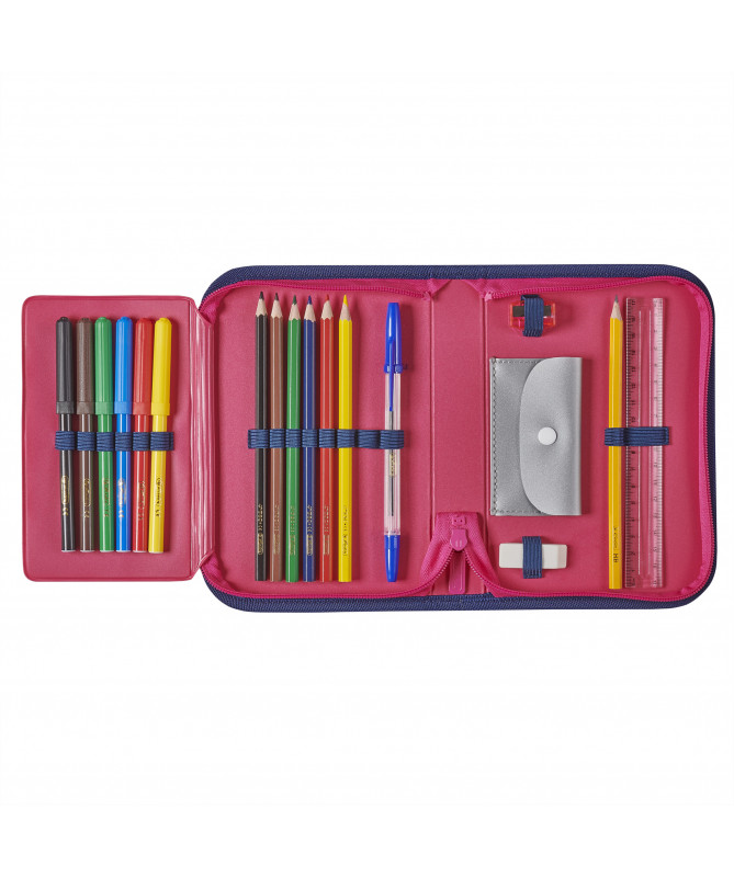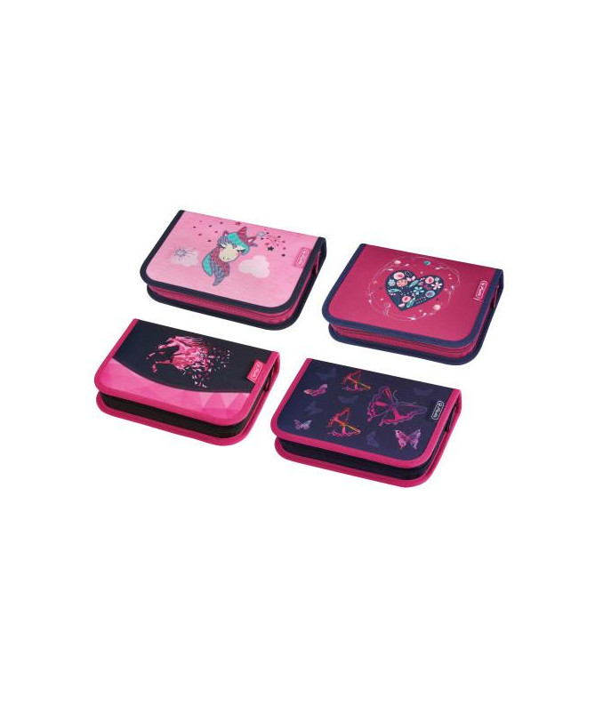 Fotrollë lapsash Herlitz e mbushur me 19 pjesë, e dizajnuar posaçërisht për vajza, ideale për shkollë fillore. Fotrolla është e prodhuar nga poliester rezistent dhe përmban 19 mjete shkollore, përfshirë lapsa druri FSC, lapsa ngjyrues dhe stilolapsa, të organizuara mirë në brendësi me kapak të brendshëm (flap). Vjen me dizajne të ndryshme për vajza si Unicorn, Heart, Magic Horse dhe Rainbow Butterfly, të dërguara në mënyrë të rastësishme.