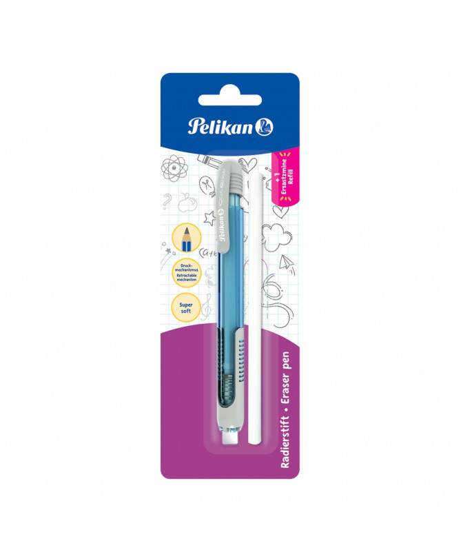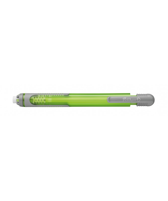 Gomë në formë lapsi Pelikan Eraser Pen, e pajisur me mekanizëm shtytës dhe minë gome të zëvendësueshme, e përshtatshme për korrigjime të sakta dhe të pastra. Dizajni praktik mundëson kontroll të mirë gjatë fshirjes, veçanërisht në detaje të imta.