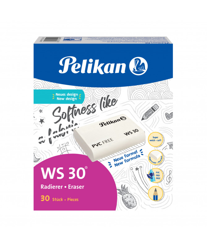 Gomë plastike Pelikan WS 30, e cilësuar për butësinë e saj të veçantë “si pambuk”, e projektuar për fshirje të pastër dhe delikate të lapsit grafit dhe për pastrim të sipërfaqes së letrës. Materiali i butë siguron fshirje efikase pa dëmtuar letrën dhe pa lënë gjurmë apo mbetje të panevojshme.