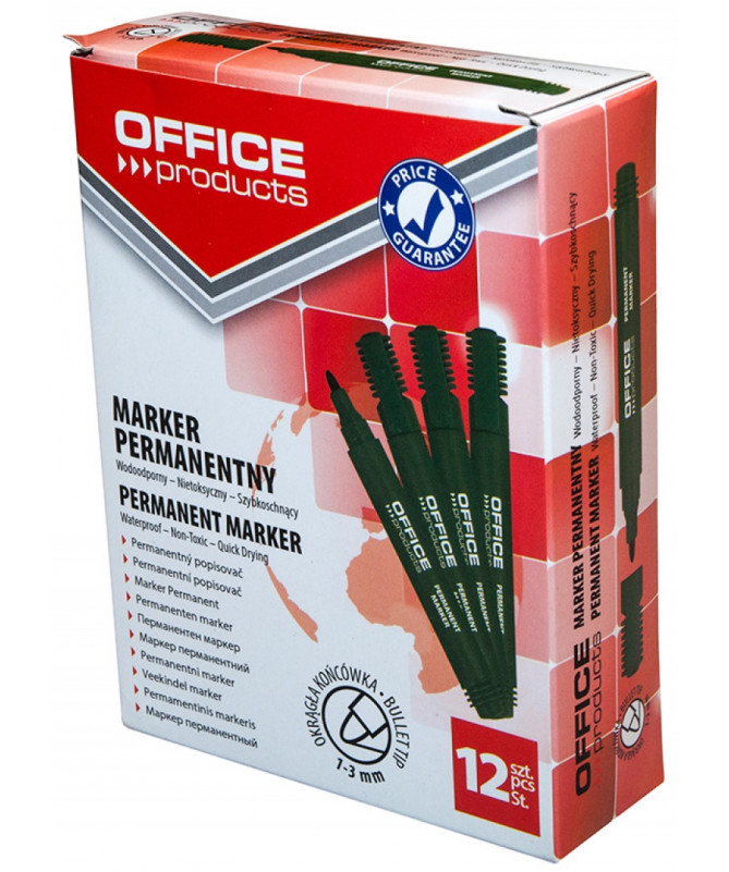 Permanent Marker OFFICE PRODUCTS është marker praktik për shkrim dhe shënime të përhershme në pothuajse të gjitha materialet. I pajisur me majë të rrumbullakët, ofron shkrim të qëndrueshëm, të njëtrajtshëm dhe të qartë, me trashësi vije 1–3 mm, të përshtatshme për shkrim të saktë dhe të kontrolluar.