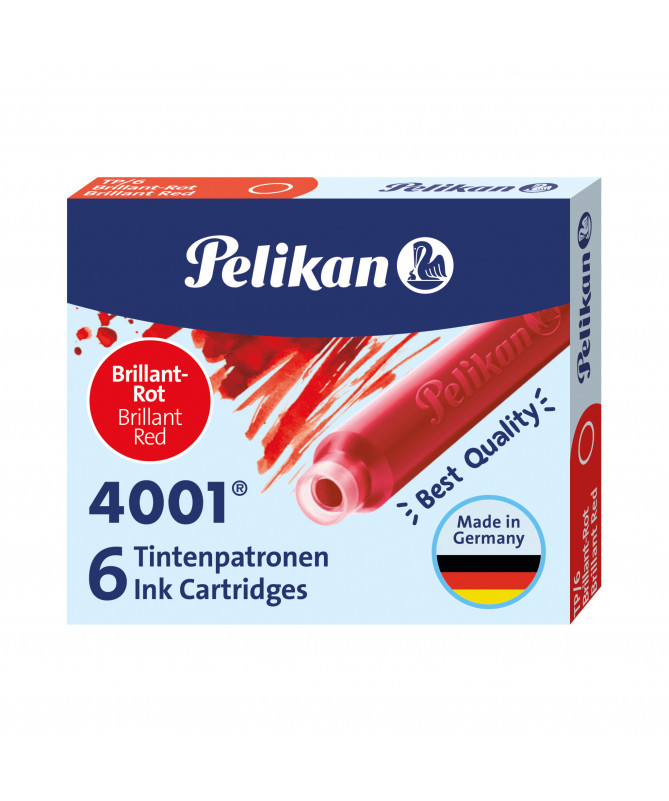Patrona për stilograf Pelikan 4001 TP/6 – Brilliant Red janë rimbushje origjinale për stilografë, të dizajnuara për shkrim të qetë, të njëtrajtshëm dhe me ngjyrë intensive.