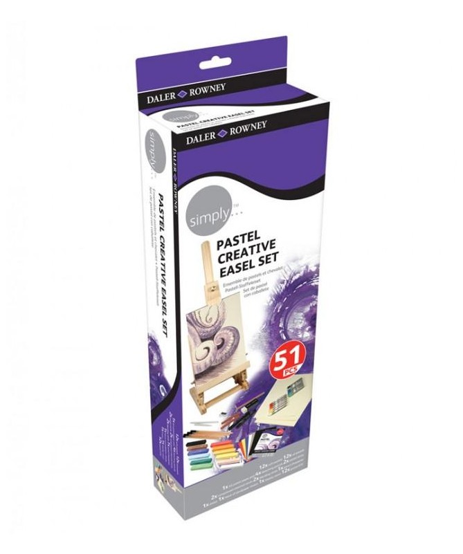 Seti Simply Pastel Creative Easel nga Daler-Rowney është një set i plotë për fillestarë dhe hobiistë, që kombinon pastelët me një mini-shtyllë vizatimi dhe mjete ndihmëse për krijim artistik. Përmban gjithsej 51 pjesë dhe ofron gjithçka që nevojitet për skicim, ngjyrosje dhe ushtrime kreative.