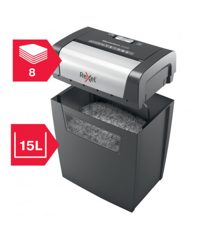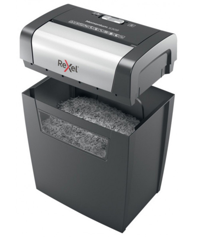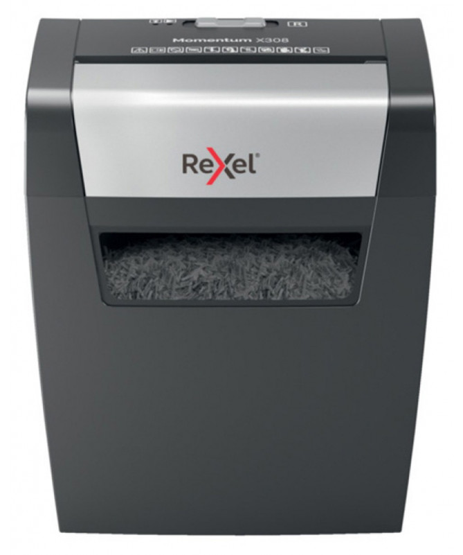 Shredder Rexel Momentum X308 është pajisje e klasës premium e projektuar për shkatërrimin e dokumenteve konfidenciale në shtëpi apo zyrë. Pajisja përdor prerje konfeti (cross-cut), duke e copëtuar letrën në grimca me përmasa 5 × 42 mm, çka ofron nivel sigurie P-3, të përshtatshëm për të dhëna personale dhe dokumente sensitive.