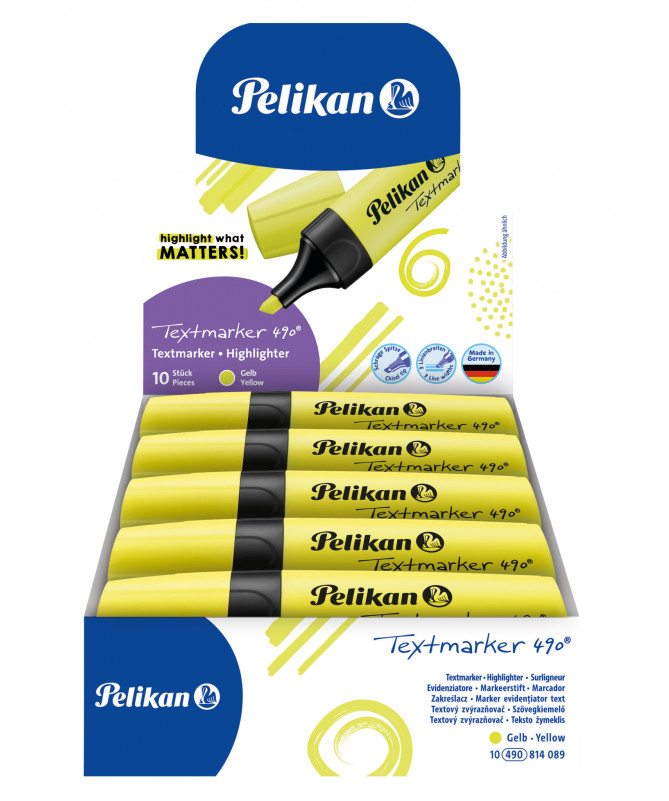 Tekstmarker Pelikan Textmarker 490 në ngjyrë të verdhë neon, i paketuar në set prej 10 copësh (folding box), ideal për theksime shumë të dukshme dhe profesionale. Boja me bazë uji ofron ndriçim të lartë dhe transparencë të shkëlqyer, duke e mbajtur tekstin të qartë dhe të lexueshëm pas shënjimit.