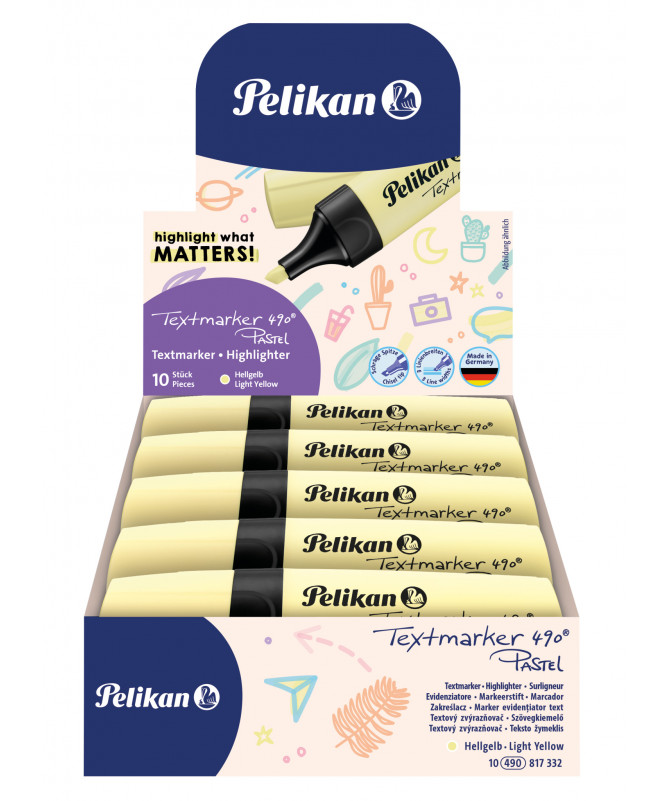 Tekstmarker Pelikan Textmarker 490 në ngjyrë e verdhë pastel, i paketuar në set prej 10 copësh (folding box), ideal për theksime të buta dhe të qarta pa mbingarkuar sytë. Boja me bazë uji siguron ndriçim të qëndrueshëm dhe transparencë të shkëlqyer, duke e mbajtur tekstin lehtësisht të lexueshëm edhe pas shënjimit.