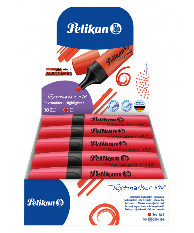 Tekstmarker Pelikan Textmarker 490 në ngjyrë të kuqe neon, i paketuar në set prej 10 copësh (folding box), ideal për theksime shumë të dukshme dhe kontrast të lartë. Boja me bazë uji siguron ndriçim intensiv dhe transparencë të mirë, duke e bërë tekstin lehtësisht të lexueshëm edhe pas shënjimit.