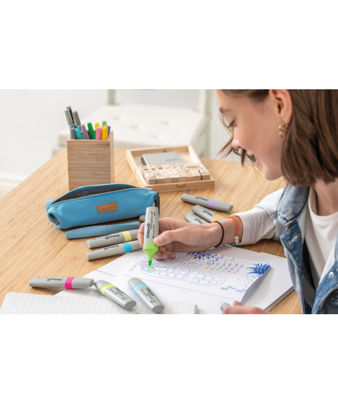 Set me 6 tekstmarkera Pelikan Textmarker 490 ECOngjyra pastel, të paketuar në një kuti praktike tip “wallet”. Ngjyrat pastel ofrojnë theksim të butë dhe harmonik, duke e bërë tekstin të dallueshëm pa e mbingarkuar vizualisht. Boja me bazë uji siguron ndriçim të njëtrajtshëm dhe transparencë të shkëlqyer, që e mban tekstin të lexueshëm edhe pas shënimit. Trupi i tekstmarkerëve është prodhuar nga rreth 80% material i ricikluar, duke e bërë këtë set një zgjedhje miqësore me mjedisin. Maja speciale lejon shënim në tre gjerësi të ndryshme, duke e bërë të përshtatshëm për studim, zyrë dhe përdorim kreativ. Dizajni ergonomik ofron rehati gjatë përdorimit, ndërsa cilësia gjermane Pelikan garanton qëndrueshmëri dhe performancë të besueshme në përdorim të përditshëm.