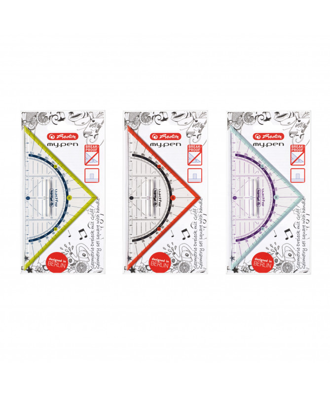 Trekëndësh gjeometrik Herlitz my.pen me gjatësi 16 cm, i pajisur me griff (kapje ergonomike) për përdorim më të rehatshëm dhe kontroll më të mirë gjatë vizatimit. I prodhuar nga plastikë rezistente dhe transparente, i përshtatshëm për përdorim të përditshëm në shkollë. Shkallëzimi i qartë siguron saktësi në matje dhe vizatim, ndërsa dizajni modern vjen në ngjyra të ndryshme. I paketuar në ambalazh transparent (blister).