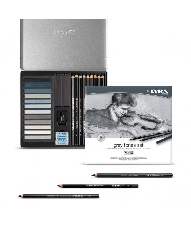 Ky set është krijuar për artistët që duan të eksplorojnë tonalitete të reja gri dhe të punojnë me një gamë të plotë nuancash nga cool grey deri te warm grey. Në kutinë metalike gjenden lloje të ndryshme lapsash thëngjilli, si dhe pastelë të butë dhe të fortë në forma të rrumbullakta dhe katrore, duke ofruar fleksibilitet të madh në vizatim dhe hijezim.